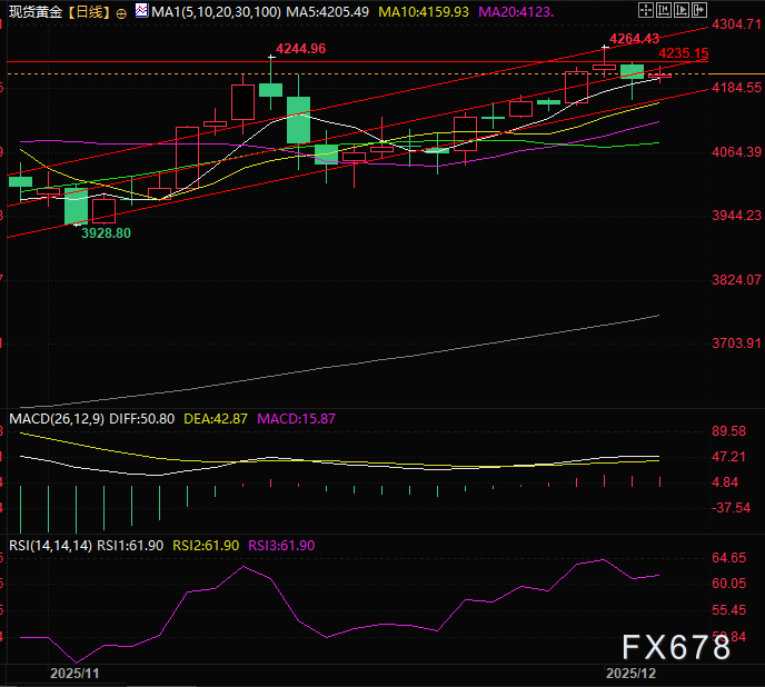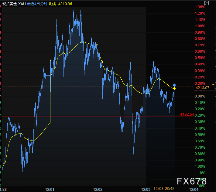 汇通财经APP讯——周三(12月3日)亚欧时段,现货黄金走出冲高回落,维持震荡格局目前受美元指数大幅下跌影响,反弹至红盘,目前交投于4211附近,周二晚纽约时段,金价受美元指数大幅冲高回落,表现出了大幅探底回升,金价一度下探至4163附近。