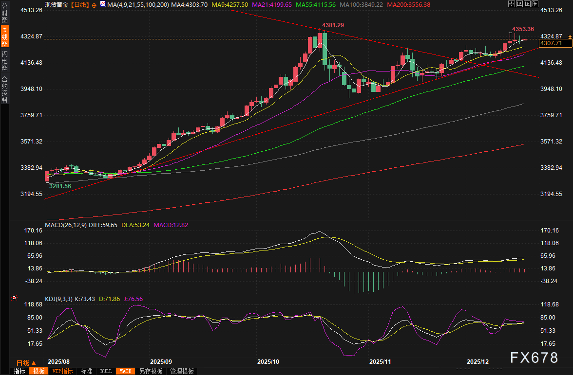 汇通财经APP讯——周二(12月16日),现货黄金价格在高位震荡,盘中一度跌至4272美元附近,却又迅速反弹至4335美元,最终收报4302美元,基本持平。这种波动并非偶然,而是受到了美国就业数据、地缘政治紧张局势以及美联储政策预期的多重影响。数据显示,美国11月就业岗位增长反弹,但失业率意外升至4.6%的四年高位,这不仅强化了市场对美联储进一步降息的预期,还推动美元指数触及两个月低点,令黄金对海外买家更具吸引力。同时,俄乌冲突的最新进展为黄金提供了潜在的避险支撑。投资者们正密切关注即将公布的CPI和PCE数据,以及美联储官员的讲话,这些因素将共同塑造黄金的短期走势。周三(12月17日)亚市早盘,现货黄金窄幅震荡,目前交投于4306美元/盎司附近。